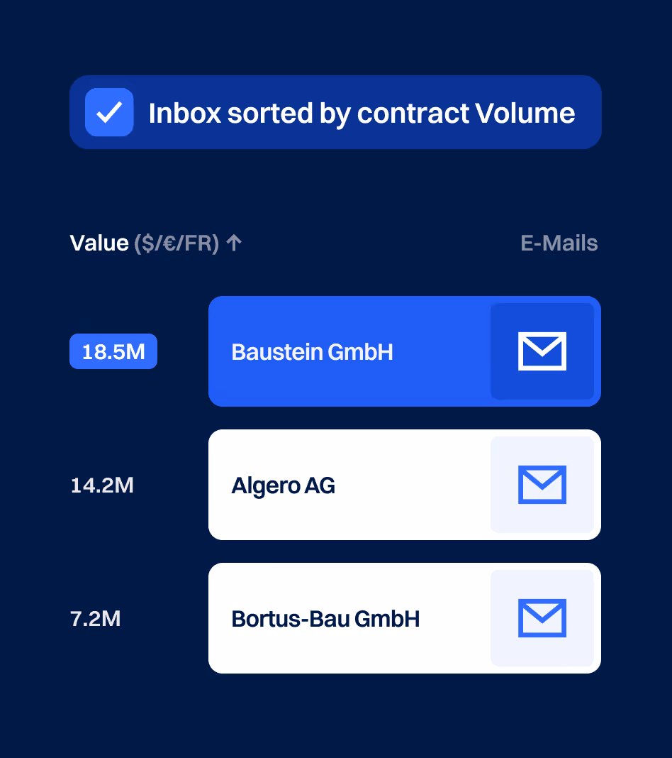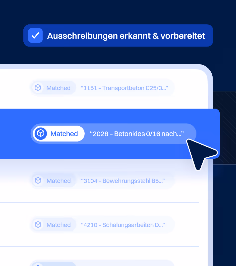 Unsere KI-Plattform liest Ausschreibungen automatisch ein, extrahiert Positionen und matcht Produkte mit einem spezialisierten Bau-KI-Agenten – und reduziert die Bearbeitungszeit um bis zu 80%. Statt im Admin zu versinken, kann sich dein Team auf hochwertige Beratung und frühe Spezifikationsarbeit konzentrieren – und so das bis zu 700 % höhere Zuschlagpotenzial heben, das entsteht, wenn du als Erster und mit dem besten Angebot im Gespräch bist.